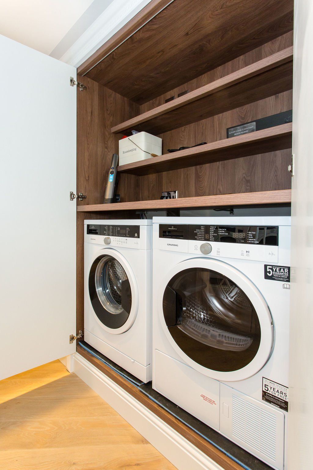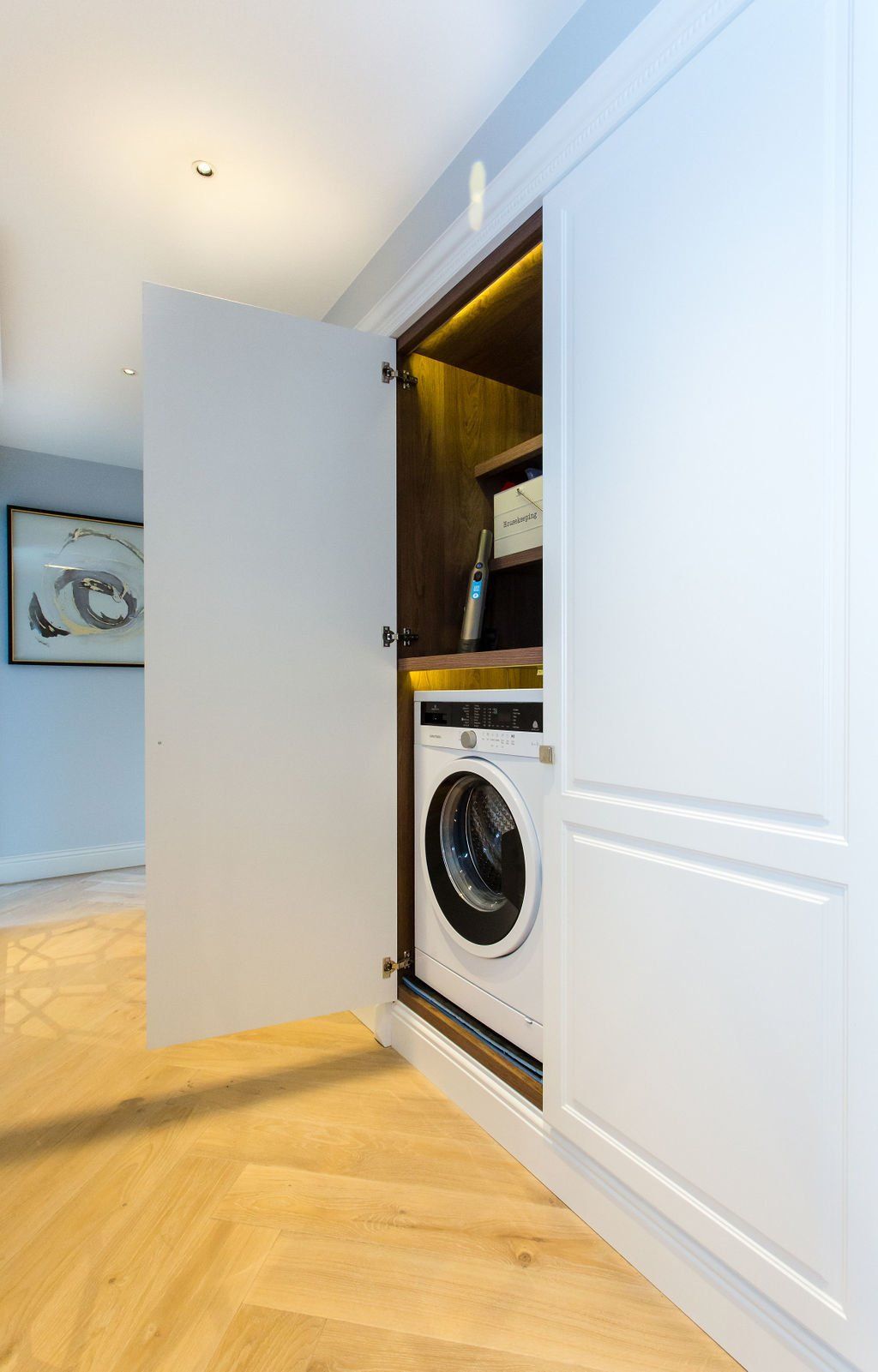 Innovative storage and space-saving solutions were imperative to this project, however functionality should never impact negatively on the style and feel of the home. We provided them with a complete turn key service down to the fully stocked kitchen designed to their individual specifications and requirements. With the kitchen opened out, the potential for unique storage solutions was broadened, for instance the island features an integrated wine cooler, whilst each storage unit has been considered carefully to utilise the space to its optimum. A sophisticated and concealed laundry system was created in the hallway to leave more space in the kitchen, the washing machine, dryer and a large clothing storage area hidden within the bespoke fitted cupboards.