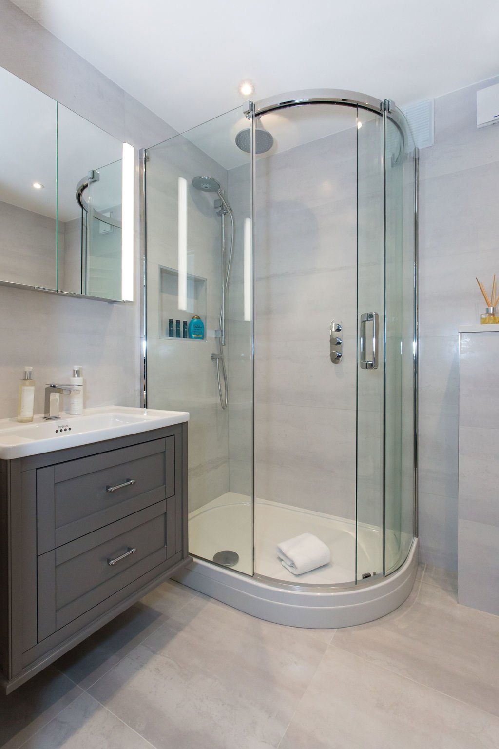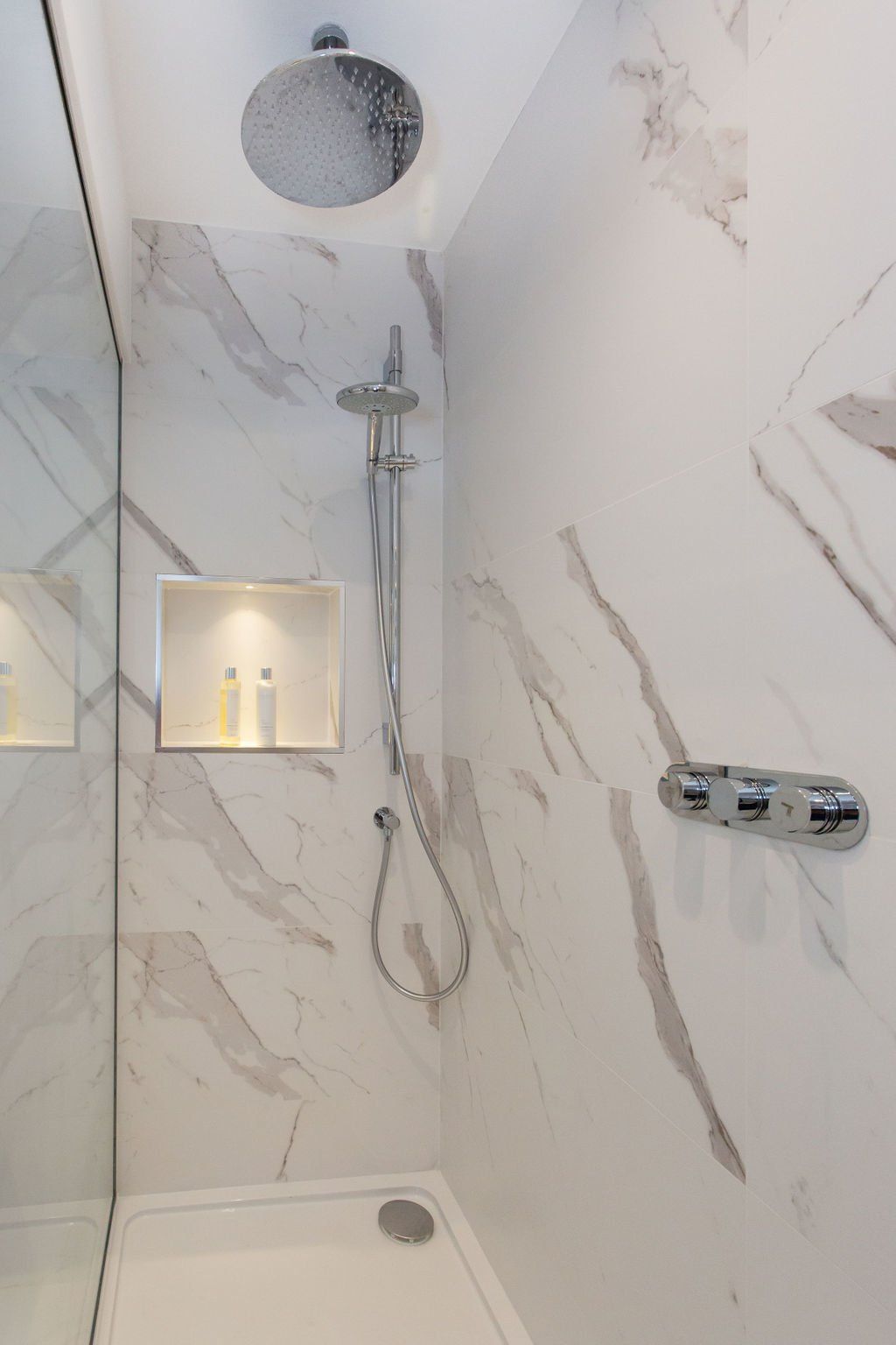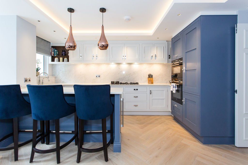 This 1950s property had a lot of potential for a comparatively small space, and required real thought and innovation to create a high-end, sophisticated and functional home from a limited space. Opening out the kitchen into the lounge to produce a charming main living area has created a light, airy interior, which has been accentuated through lighting in the perimeter of the ceiling. This subtle lighting softly frames the room, ensuring an aura of spaciousness, the ceiling appearing higher bringing attention to the feature droplights above the breakfast bar.